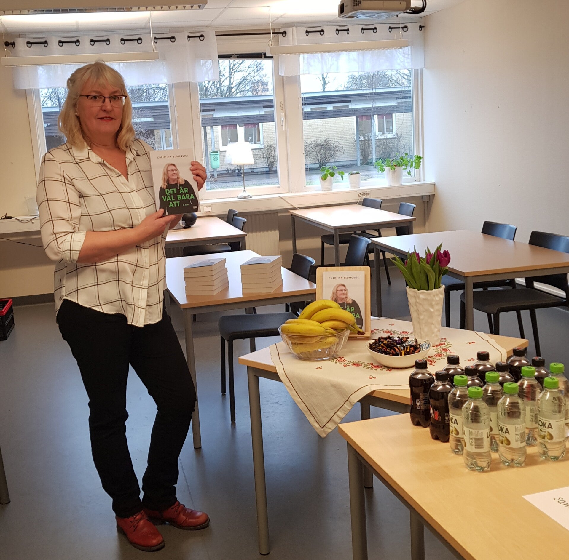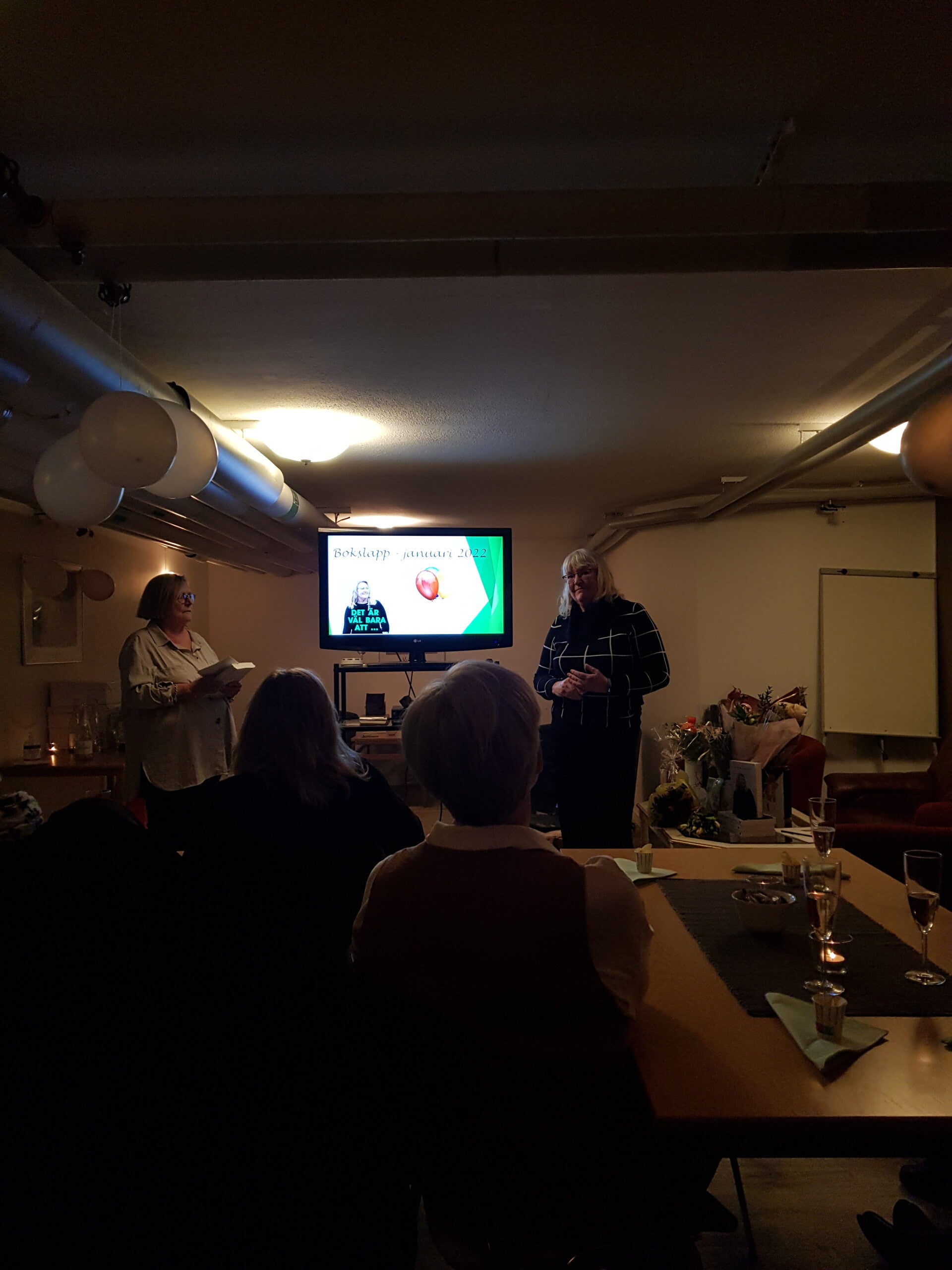 Releaseparty för släkt och vänner i en källarlokal. Det mysiga caféet, där jag bokat lokal, ställer in några dagar innan boksläppet pga av rädsla för pandemin. Fullt förståeligt men lite panik uppstår. Hur hittar jag en lokal? Bostadrättsföreningens samlingslokal är ledig så det får bli det.