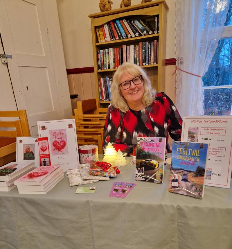 Att få prata om mina böcker är ofantligt roligt och tiden går fort. "Kärleksband" och "Det är völ bara att ..." finns också på mitt bokbord men det är mina feelgood som de flesta är intresserade av denna dag. Många tycker det är extra intressant eftersom det är just i Granbergsdal upplösningen sker i den första boken och min andra bok utspelar sig i Karlskoga. Kul med lokalanknytning, tycker många.
